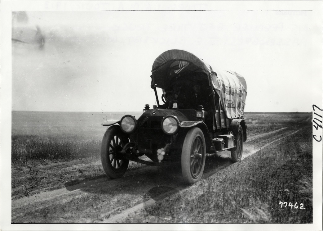 View of Premier G & J tire truck traveling on rural dirt road during the 1913 transcontinental tour organized by Indiana Automobile Manufacturers' Association. Truck is decorated to resemble a covered wagon. Handwritten on back: "Premier, G & J tire truck, no. 15, J.E. Blickert, Walter Weidley. Tours--I.A.M.A, 1913."