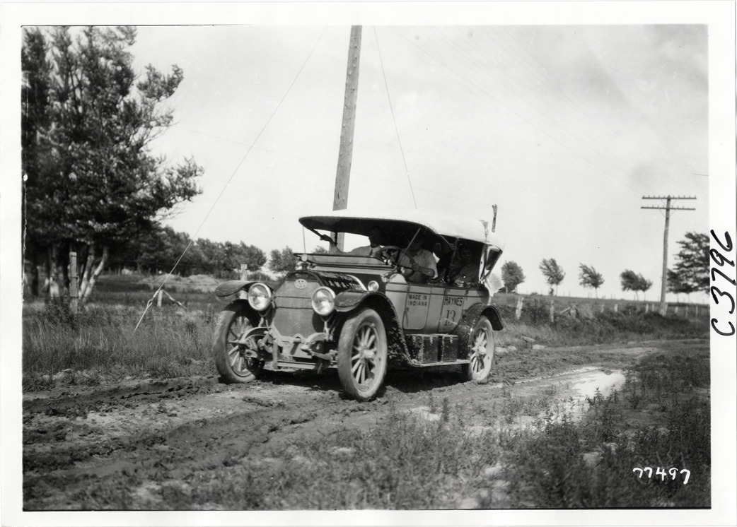 Motorists in Haynes automobile traveling on rural road, 1913 Indiana Automobile Manufacturers' Association tour