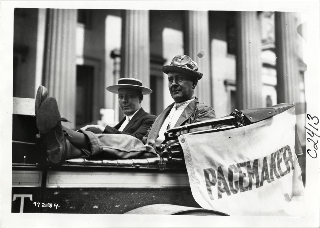 Motorists sitting in rear seat of pacemaker automobile, 1913 Indiana Automobile Manufacturers' Association tour
