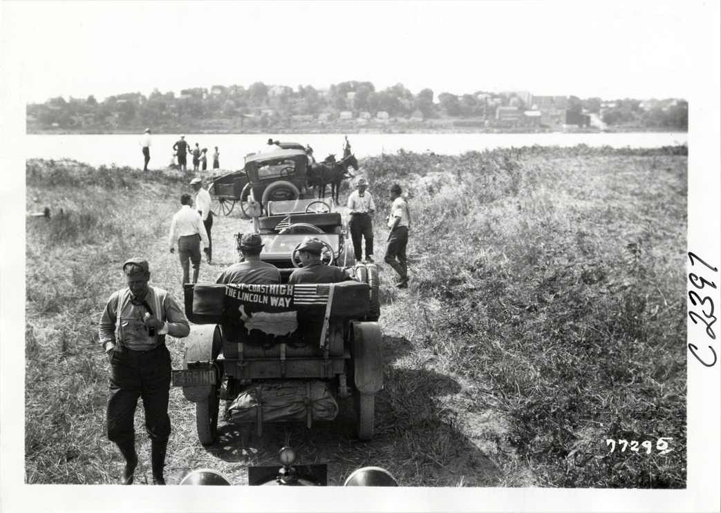 Rear view of motorists with cars and horse-drawn wagon waiting at edge of river during the 1913 transcontinental tour organized by Indiana Automobile Manufacturers' Association. Handwritten on back: "Tours--I.A.M.A, 1913."