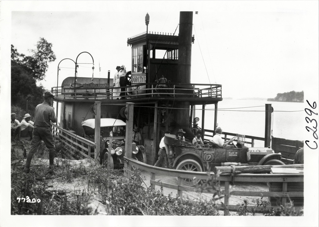 Automobiles on the ferry "Dorothy," 1913 Indiana Automobile Manufacturers' Association tour