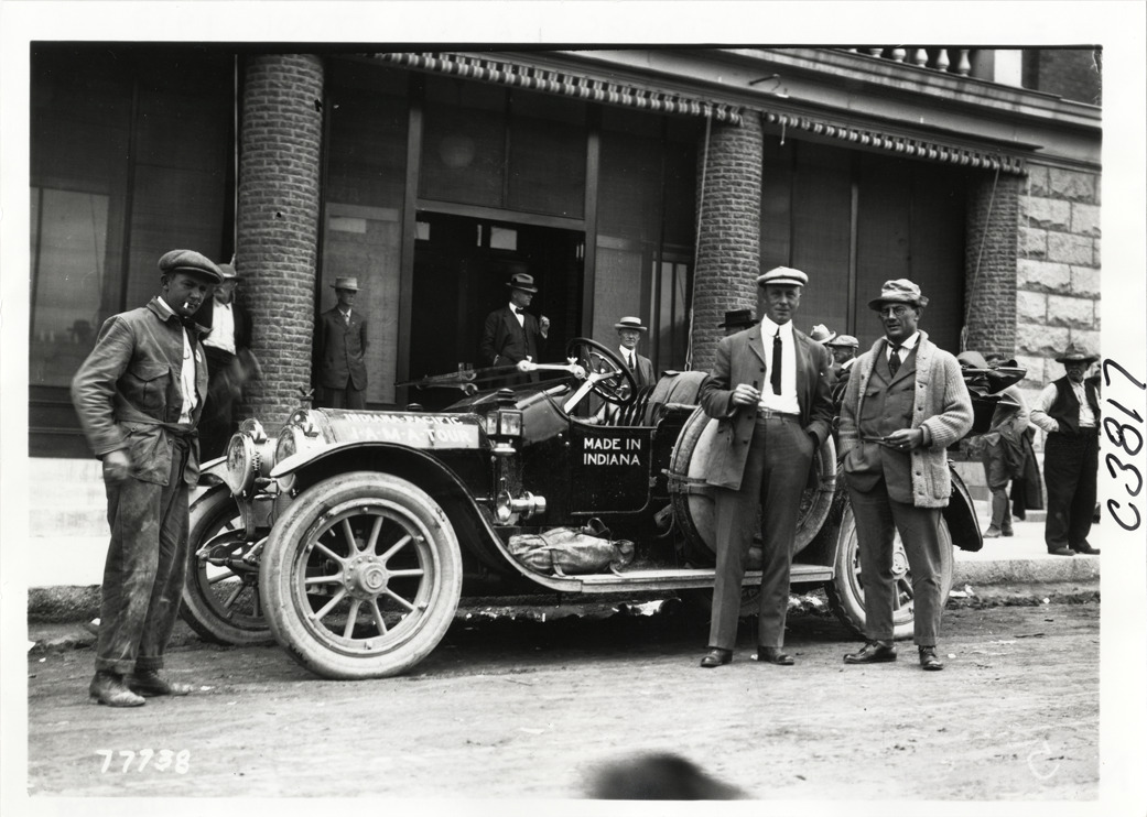 View of men posing with Marmon car no. 22 during the 1913 transcontinental tour organized by Indiana Automobile Manufacturers' Association. Handwritten on back: "#22 Marmon. Passengers: Carl G. Fisher, Charles A. Bookwalter, Robert Tyndall, Heine Schoeller. Tours--I.A.M.A, 1913."