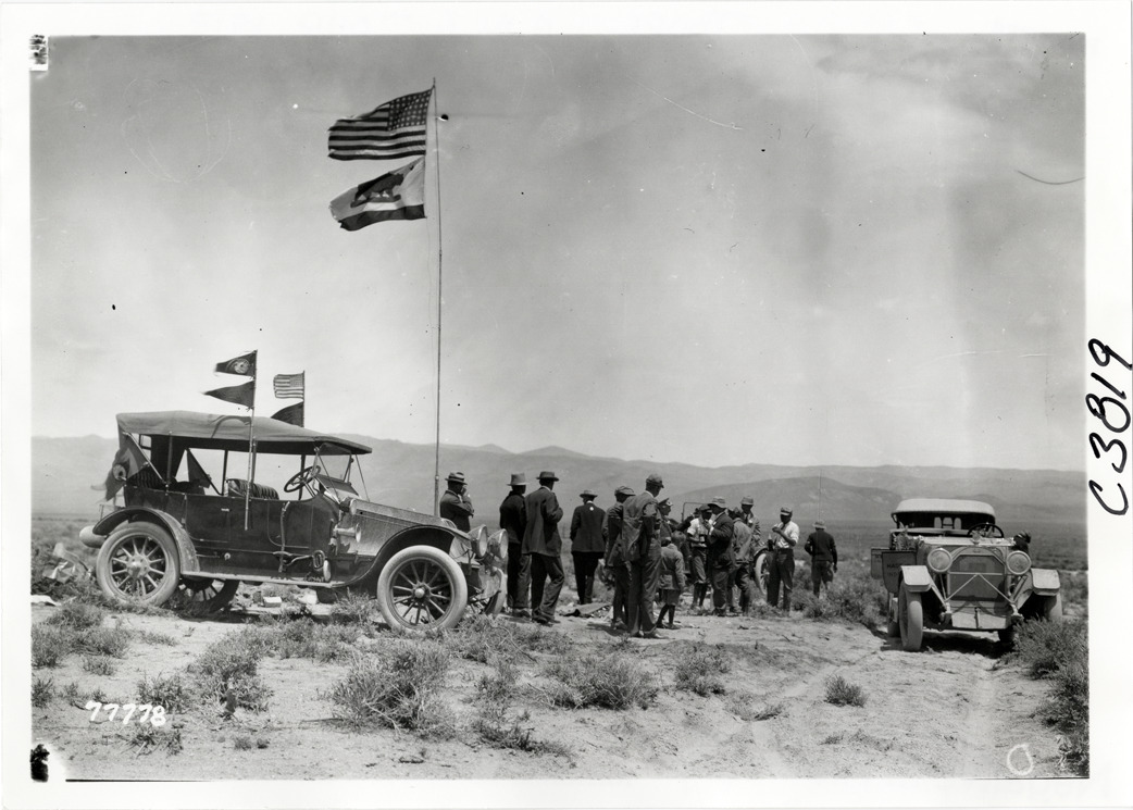 Motorists with automobiles in desert, 1913 Indiana Automobile Manufacturers' Association tour