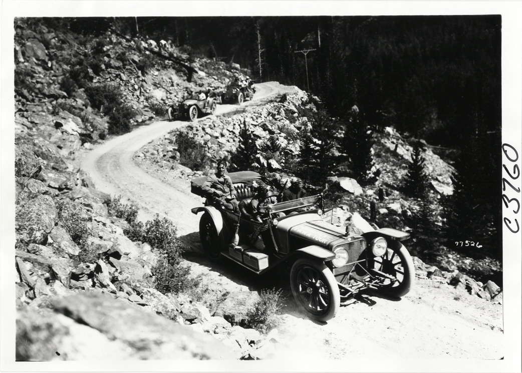 View of motorists in American car no. 2 on mountain road, followed by other cars, during the 1913 transcontinental tour organized by Indiana Automobile Manufacturers' Association. Handwritten on back: "#2 American. Passengers: Ray Price, Dr. C.R. Strickland, Eddie Gouth. Tours--I.A.M.A, 1913."