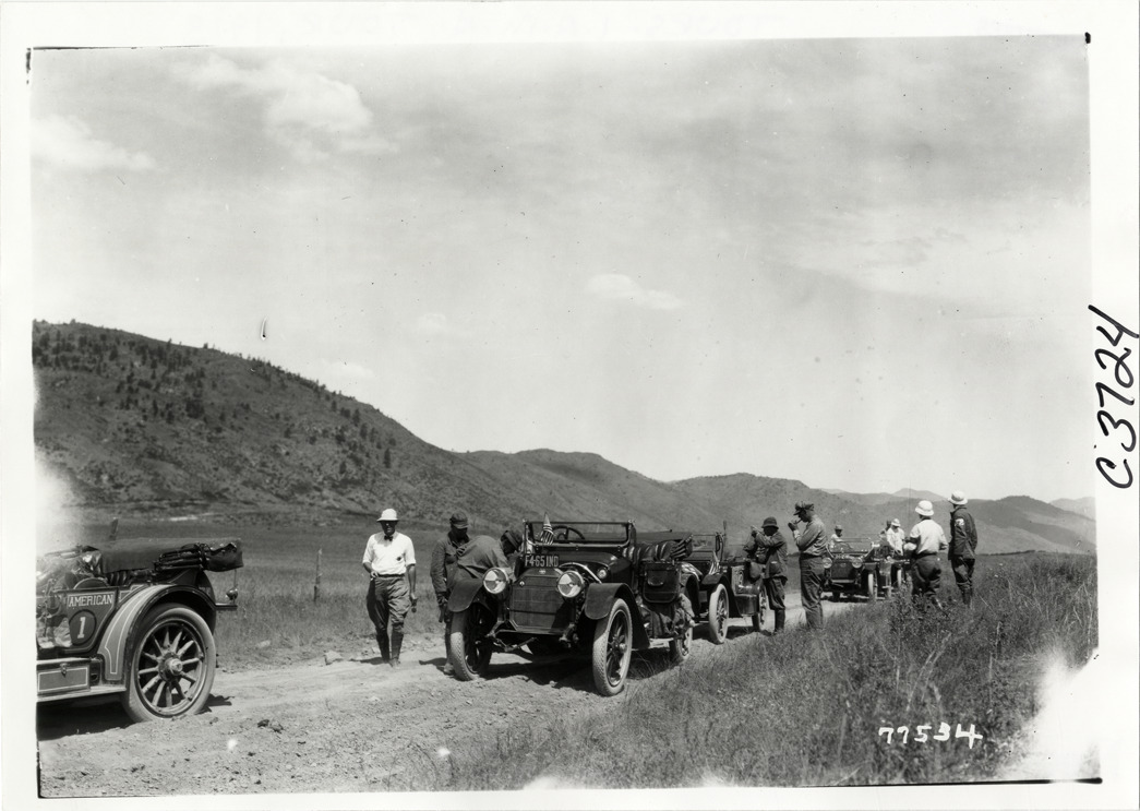 Motorists with automobiles on rural road, 1913 Indiana Automobile Manufacturers' Association tour