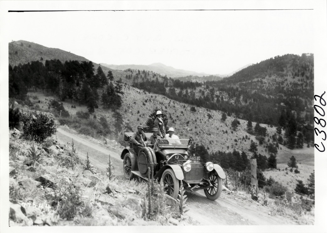 View of motorists in McFarlan car no. 16 traveling on mountain road during the 1913 transcontinental tour organized by Indiana Automobile Manufacturers' Association. Handwritten on back: "#16 McFarlan. Passengers: A. Dixon, Guy C. Core, Christopher Cox, Bert Adams. Tours--I.A.M.A, 1913."