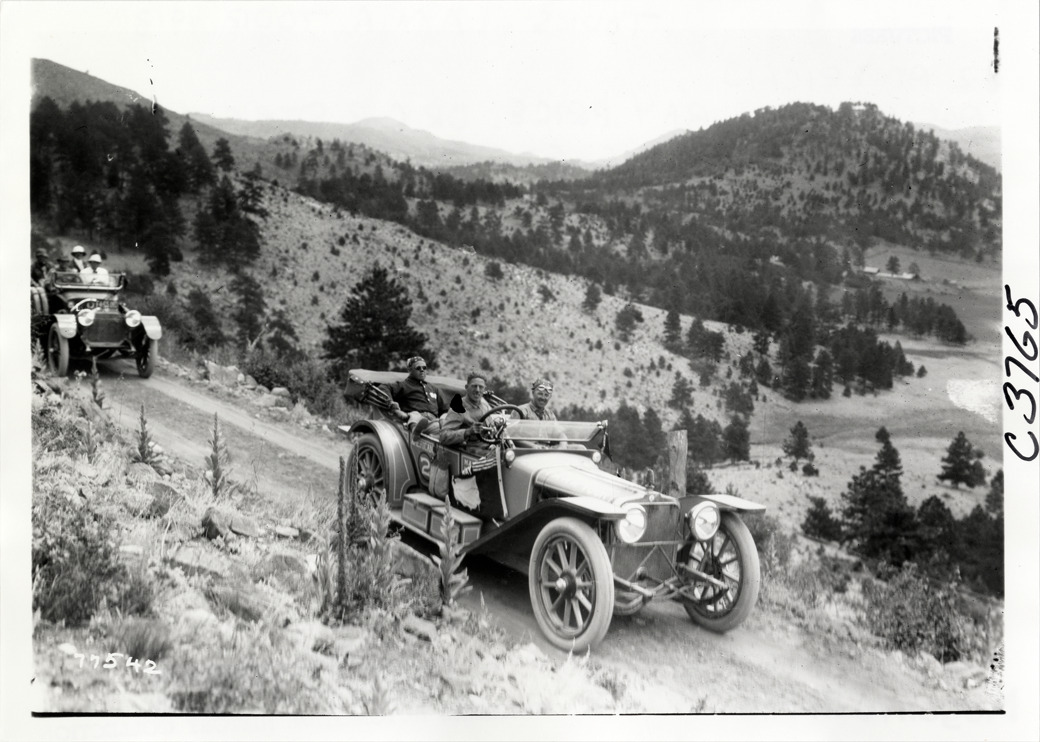 Motorists in American automobile on mountain road, 1913 Indiana Automobile Manufacturers' Association tour