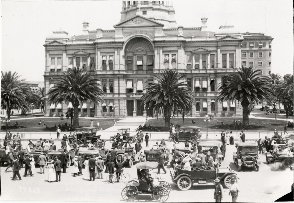 Automobiles parked in front of state capitol building, 1913 Indiana Automobile Manufacturers' Association tour