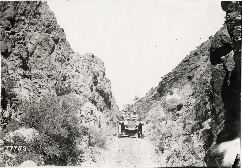 View of motorists in car traveling on mountain road during the 1913 transcontinental tour organized by Indiana Automobile Manufacturers' Association. Handwritten on back: "Tours--I.A.M.A, 1913."