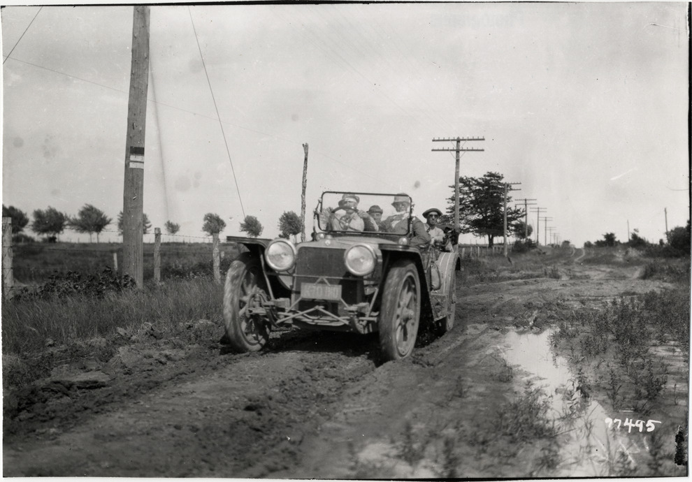 View of motorists in car traveling on muddy rural road during the 1913 transcontinental tour organized by Indiana Automobile Manufacturers' Association. Handwritten on back: "Tours--I.A.M.A, 1913."