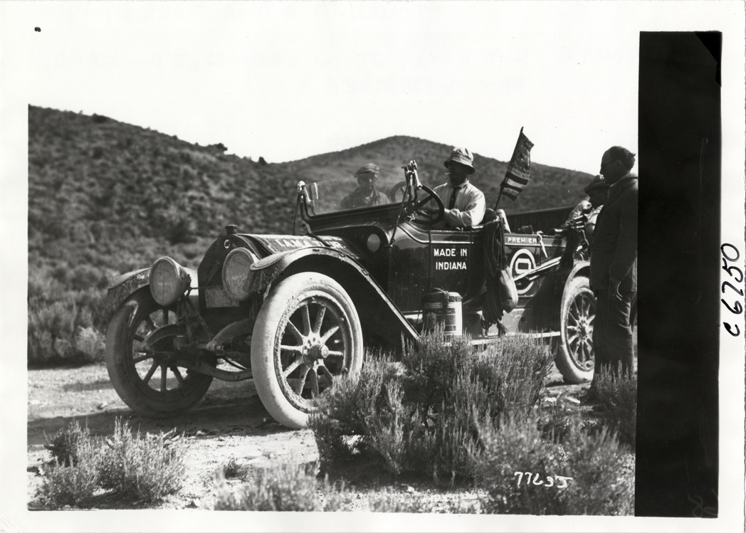 Motorists in Premier automobile on desert road, 1913 Indiana Automobile Manufacturers' Association tour