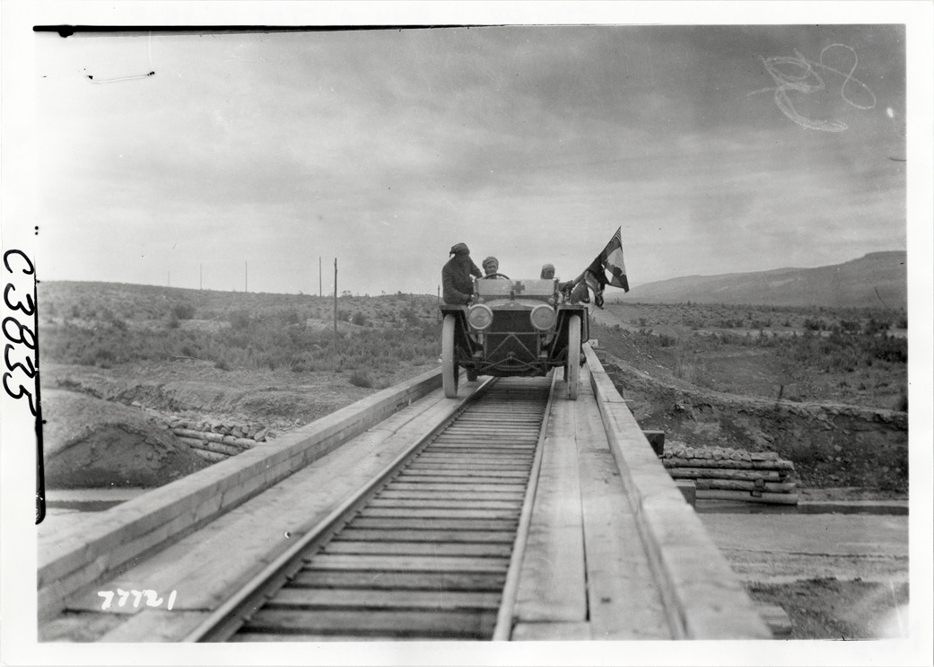 View of motorists in American car no. 1 crossing railroad bridge during the 1913 transcontinental tour organized by Indiana Automobile Manufacturers' Association. Handwritten on back: "#1 American. Passengers: Ernest I. Lewis, D.L. Mobley, Charles Boyden. Tours--I.A.M.A, 1913."