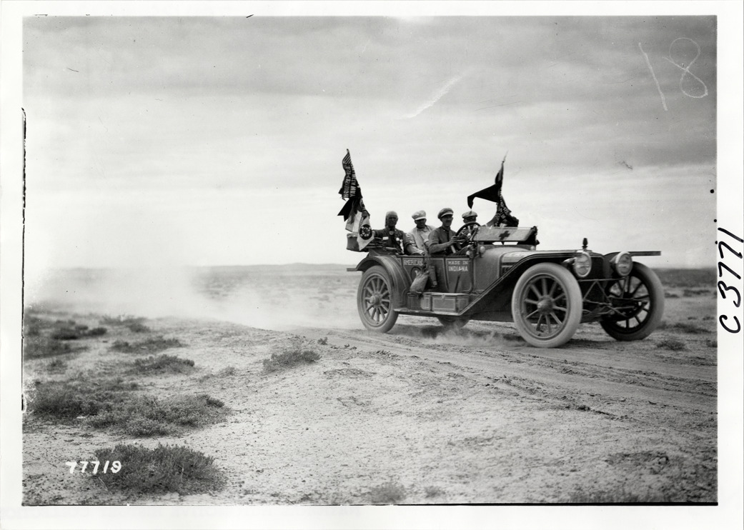Motorists in American automobile traveling on desert road, 1913 Indiana Automobile Manufacturers' Association tour