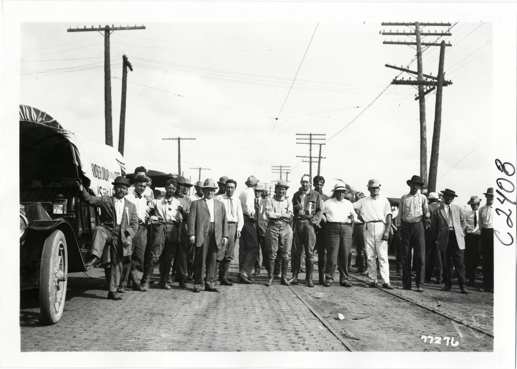 View of motorists posing in road during the 1913 transcontinental tour organized by Indiana Automobile Manufacturers' Association. Handwritten on back: "Tours--I.A.M.A, 1913."