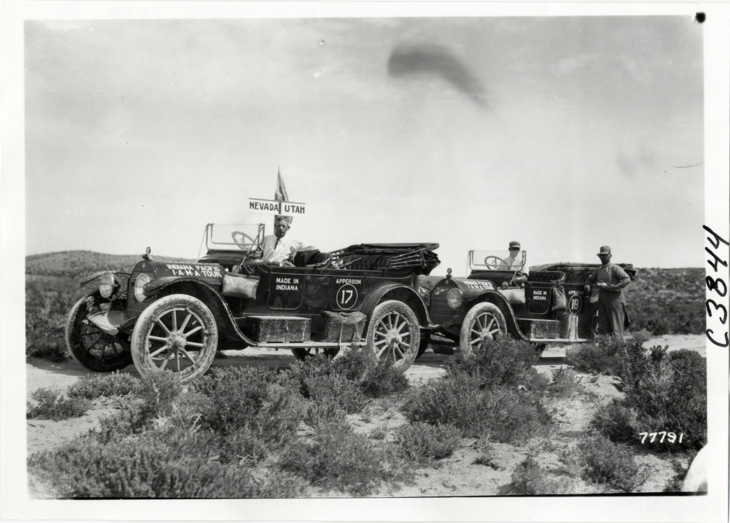 View of motorists with Apperson cars no. 17 and no. 18 on desert road during the 1913 transcontinental tour organized by Indiana Automobile Manufacturers' Association. "Nevada-Utah" sign and American flag in background. Handwritten on back: "#17 Apperson. Passengers: J.C. Sampsel, Dr. J.C. Sexton, Nelson McLain. #18 Apperson. Passengers: 'Eddie' Edenburn, Max Winters. Tours--I.A.M.A, 1913."
