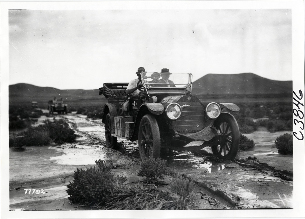 View of motorists in Apperson car no. 17 traveling on flooded stretch of desert road during the 1913 transcontinental tour organized by Indiana Automobile Manufacturers' Association. Handwritten on back: "#17 Apperson. Passengers: J.C. Sampsel, Dr. J.C. Sexton, Nelson McLain. Tours--I.A.M.A, 1913."