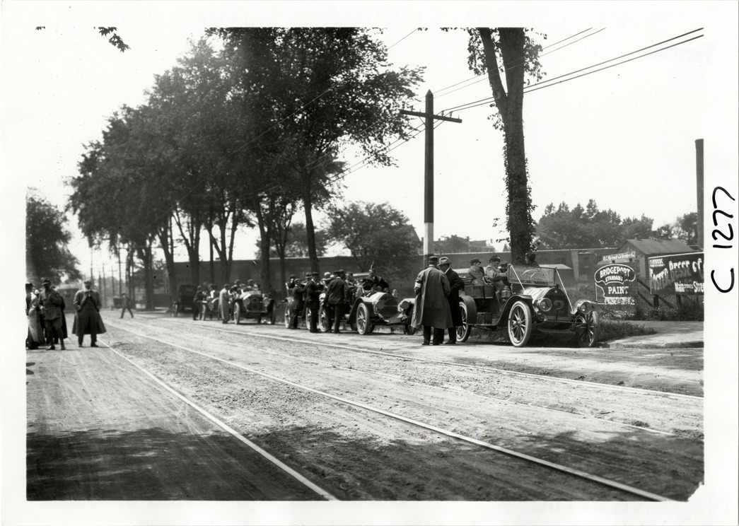 Motorists with automobiles lined up in street, 1910 Long Island Endurance Run