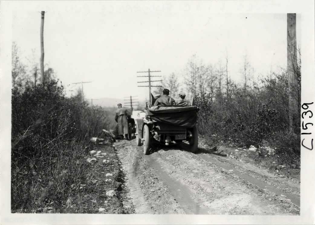 Rear view of motorists with two cars on rural dirt road during the 1910 Long Island endurance run. Members of the Long Island Automobile Club and the Crescent Athletic Club participated in the contest. Handwritten on back: "Tours--L.I.A.C. Endurance Run, 1910."