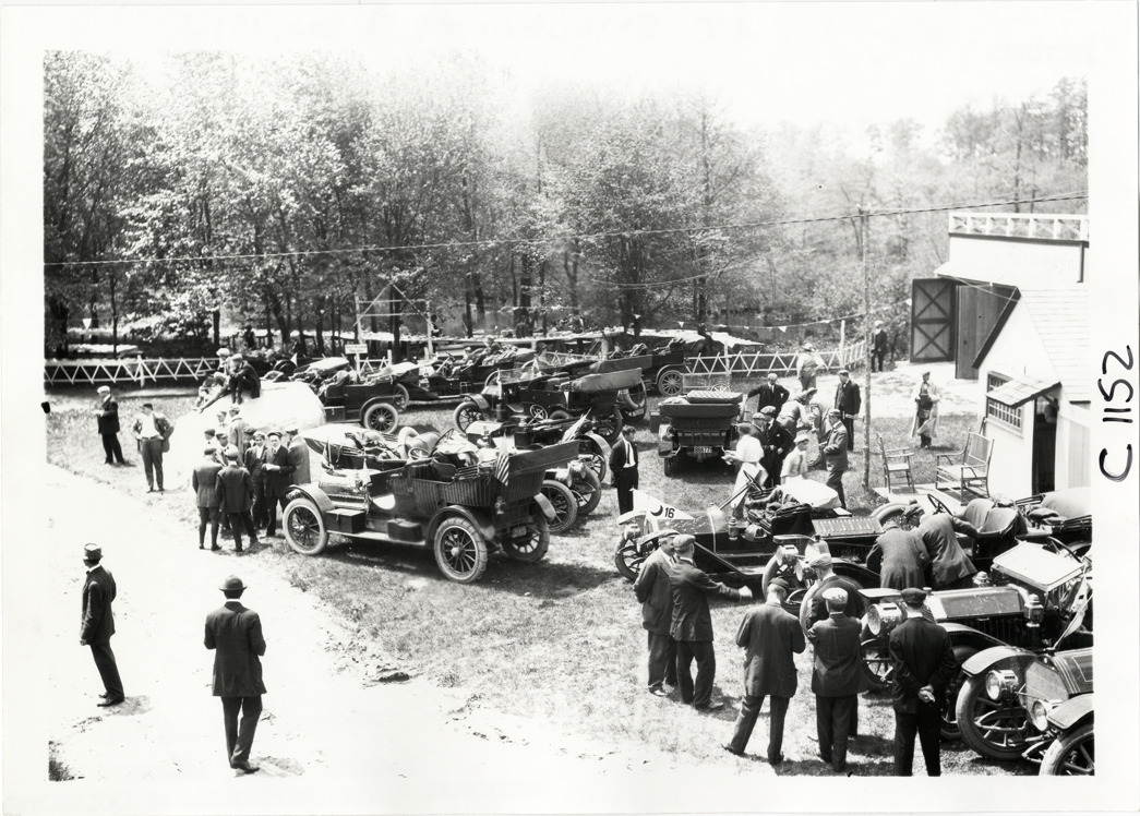 View of motorists and cars on the grounds of the Anchorage Inn during the 1910 Long Island endurance run. Members of the Long Island Automobile Club and the Crescent Athletic Club participated in the contest. Handwritten on back: "Tours--L.I.A.C. Endurance Run, 1910."