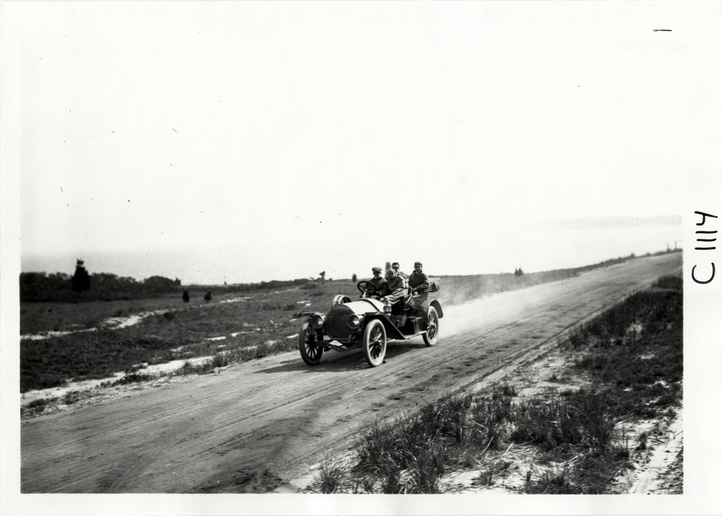 View of motorists in car traveling on rural dirt road during the 1910 Long Island endurance run. Members of the Long Island Automobile Club and the Crescent Athletic Club participated in the contest. Handwritten on back: "Tours--L.I.A.C. Endurance Run, 1910."