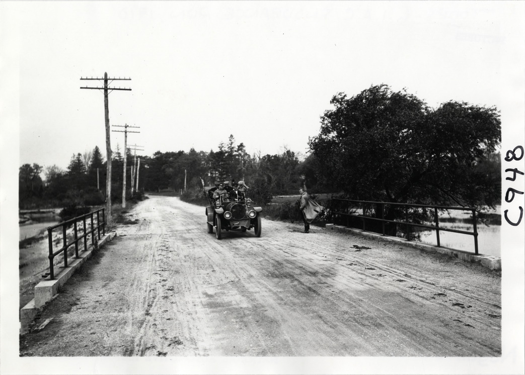 Motorists in automobile traveling on rural road, 1910 Long Island Endurance Run
