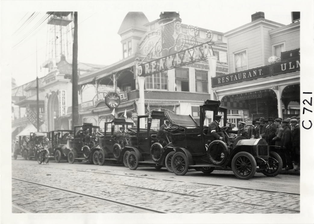 Automobiles parked in front of Dreamland amusement park, 1910 Long Island Endurance Run