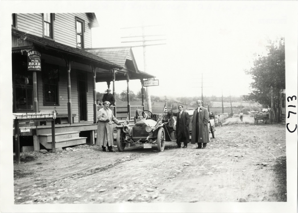 Motorists posing with automobile in front of Albert Hotel, 1910 Long Island Endurance Run