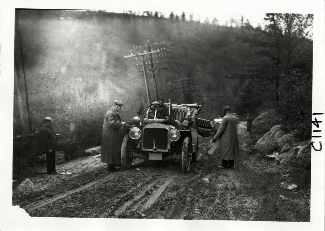 Motorists with automobile on rural road, 1910 Long Island Endurance Run