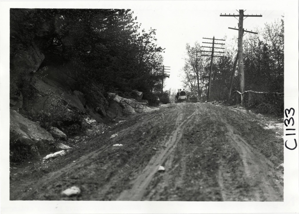 Rear view of motorists in car traveling on rural dirt road during the 1910 Long Island endurance run. Members of the Long Island Automobile Club and the Crescent Athletic Club participated in the contest. Handwritten on back: "Tours--L.I.A.C. Endurance Run, 1910."
