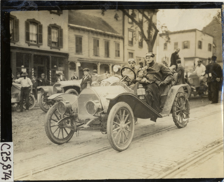 Motorists posing in Hupmobile automobile, 1909 Munsey Reliability Run