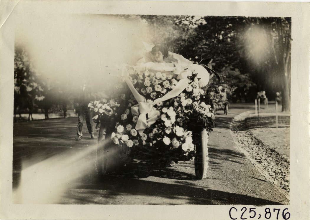Woman posing in car decorated with roses for parade at Washington, D.C., 1909 Munsey Reliability Run