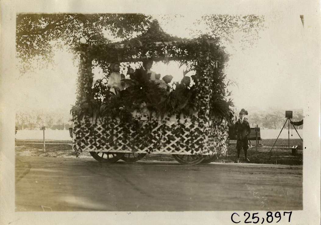 View of float for parade at Washington, D.C. during the 1909 Munsey Reliability Run. Float resembles gazebo and trellis decorated with flowers. Stamped on back: "Photo by Spooner & Wells, Inc. 1931 Broadway, N.Y." Handwritten on back: "Tours--Munsey Reliability Run, 1909."