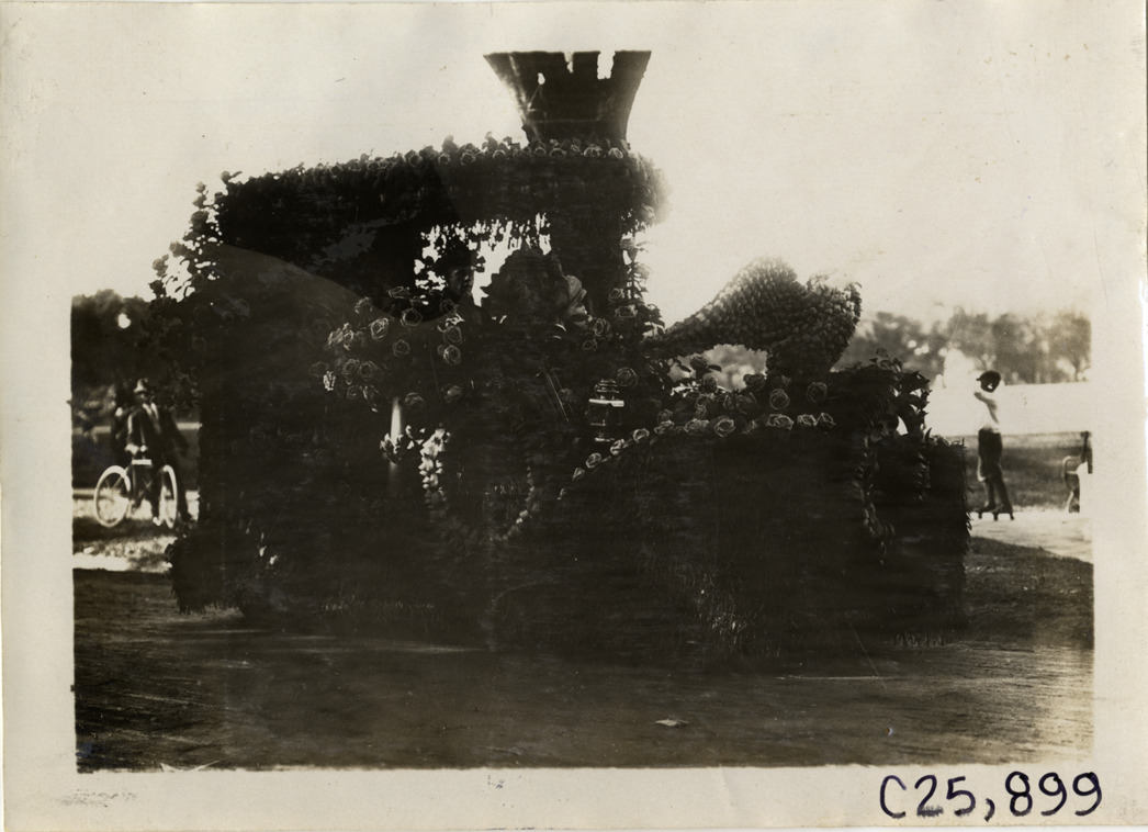 View of float for parade at Washington, D.C. during the 1909 Munsey Reliability Run. Float is covered with floral decorations. Stamped on back: "Photo by Spooner & Wells, Inc. 1931 Broadway, N.Y." Handwritten on back: "Tours--Munsey Reliability Run, 1909."