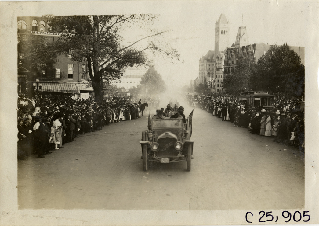 View of spectators watching motorists in National car on Pennsylvania Ave. at Washington, D.C. during the 1909 Munsey Reliability Run. Post office and streetcar in background. Stamped on back: "Photo by Spooner & Wells, Inc. 1931 Broadway, N.Y." Handwritten on back: "Tours--Munsey Reliability Run, 1909."