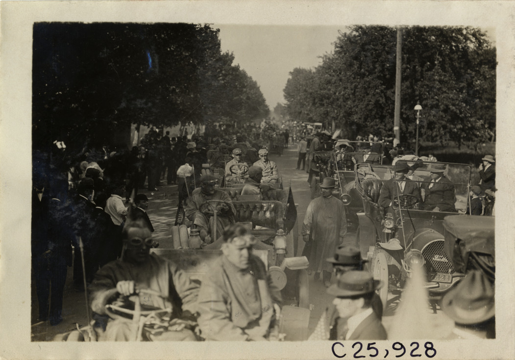 View of motorists with cars lined up in road during the 1909 Munsey Reliability Run. Stamped on back: "Photo by Spooner & Wells, Inc. 1931 Broadway, N.Y." Handwritten on back: "Tours--Munsey Reliability Run, 1909."