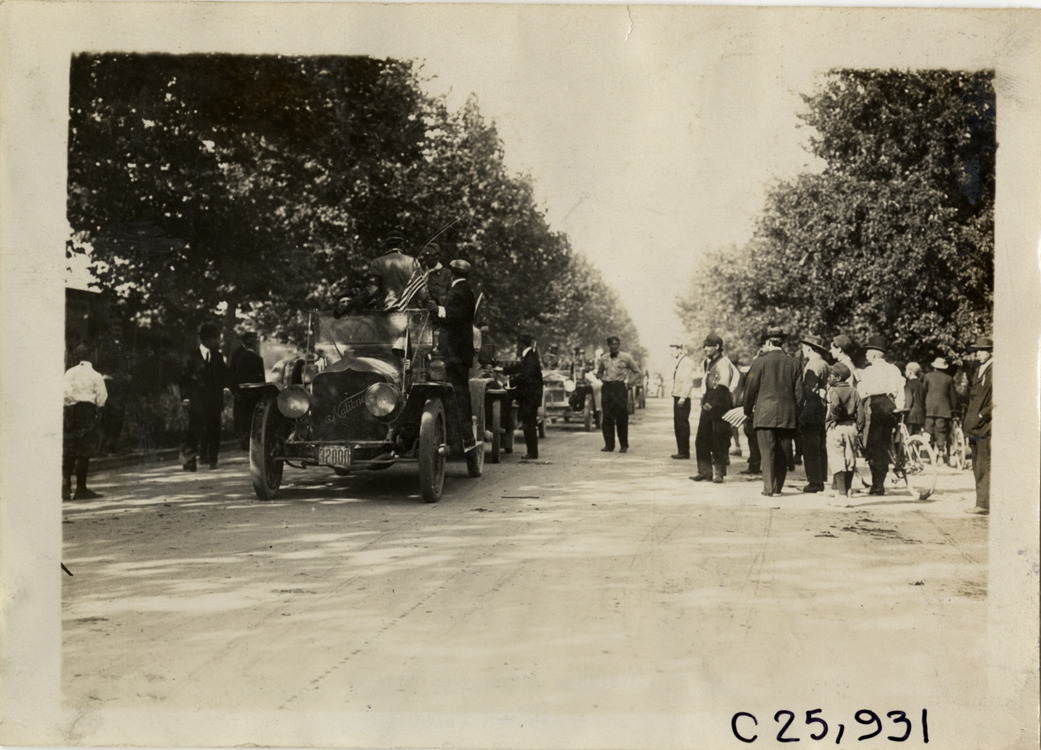 View of motorists in National car during the 1909 Munsey Reliability Run. Spectators stand on roadside. Stamped on back: "Photo by Spooner & Wells, Inc. 1931 Broadway, N.Y." Handwritten on back: "Tours--Munsey Reliability Run, 1909."