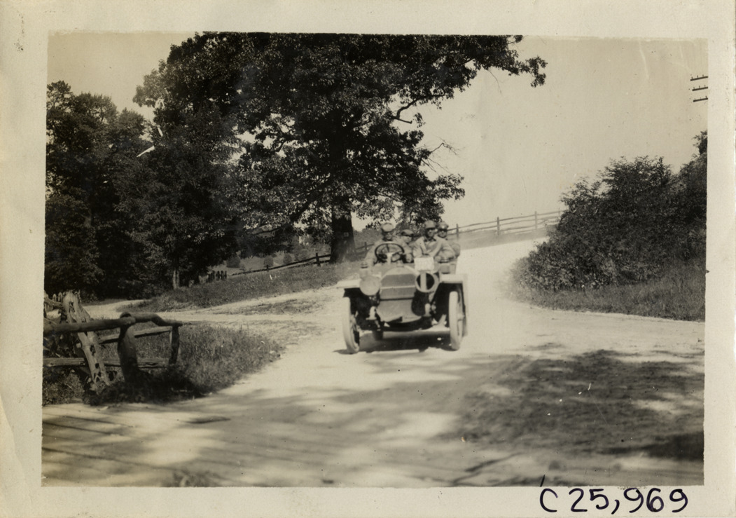 View of motorists in car traveling on rural dirt road during the 1909 Munsey Reliability Run. Stamped on back: "Photo by Spooner & Wells, Inc. 1931 Broadway, N.Y." Handwritten on back: "Tours--Munsey Reliability Run, 1909."