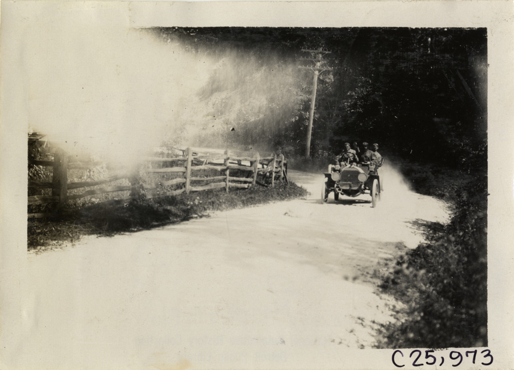 View of motorists in car traveling on rural dirt road during the 1909 Munsey Reliability Run. Stamped on back: "Photo by Spooner & Wells, Inc. 1931 Broadway, N.Y." Handwritten on back: "Tours--Munsey Reliability Run, 1909."