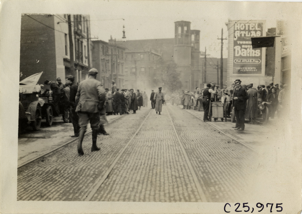 View of motorists with cars on brick street during the 1909 Munsey Reliability Run. Commercial buildings in background. Stamped on back: "Photo by Spooner & Wells, Inc. 1931 Broadway, N.Y." Handwritten on back: "Tours--Munsey Reliability Run, 1909."