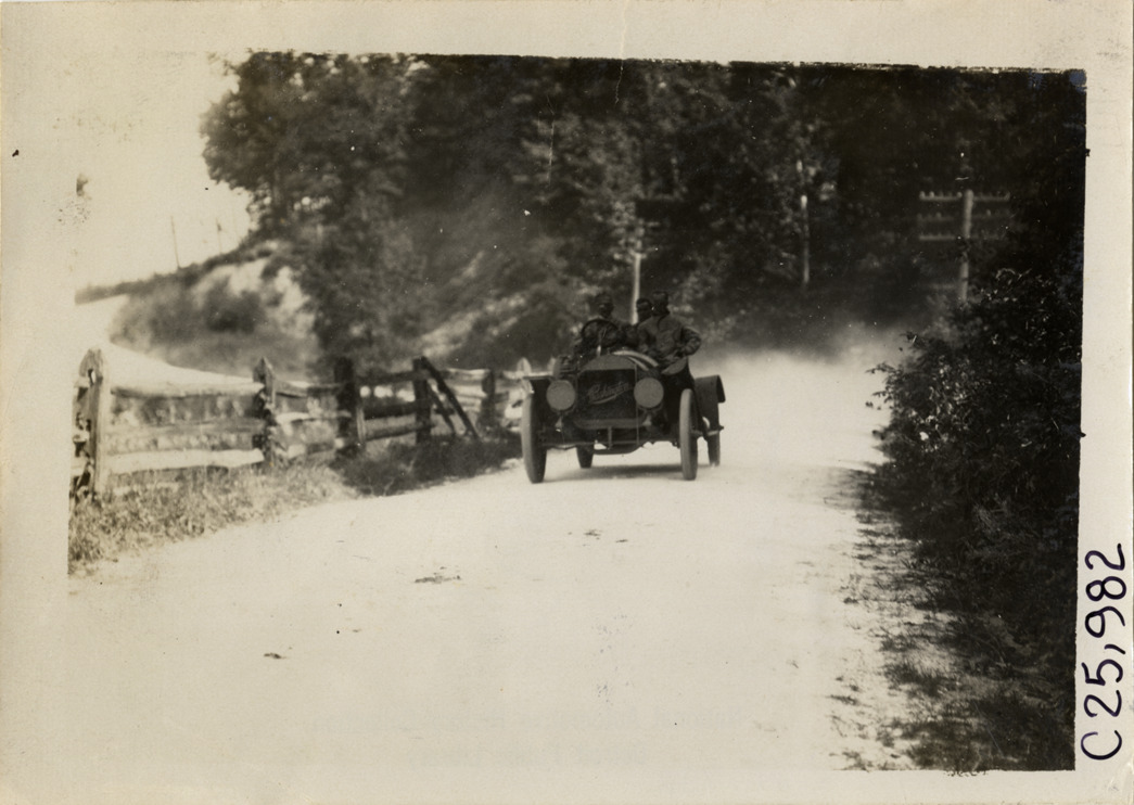 View of motorists in Washington car traveling on rural dirt road during the 1909 Munsey Reliability Run. Stamped on back: "Photo by Spooner & Wells, Inc. 1931 Broadway, N.Y." Handwritten on back: "Tours--Munsey Reliability Run, 1909."