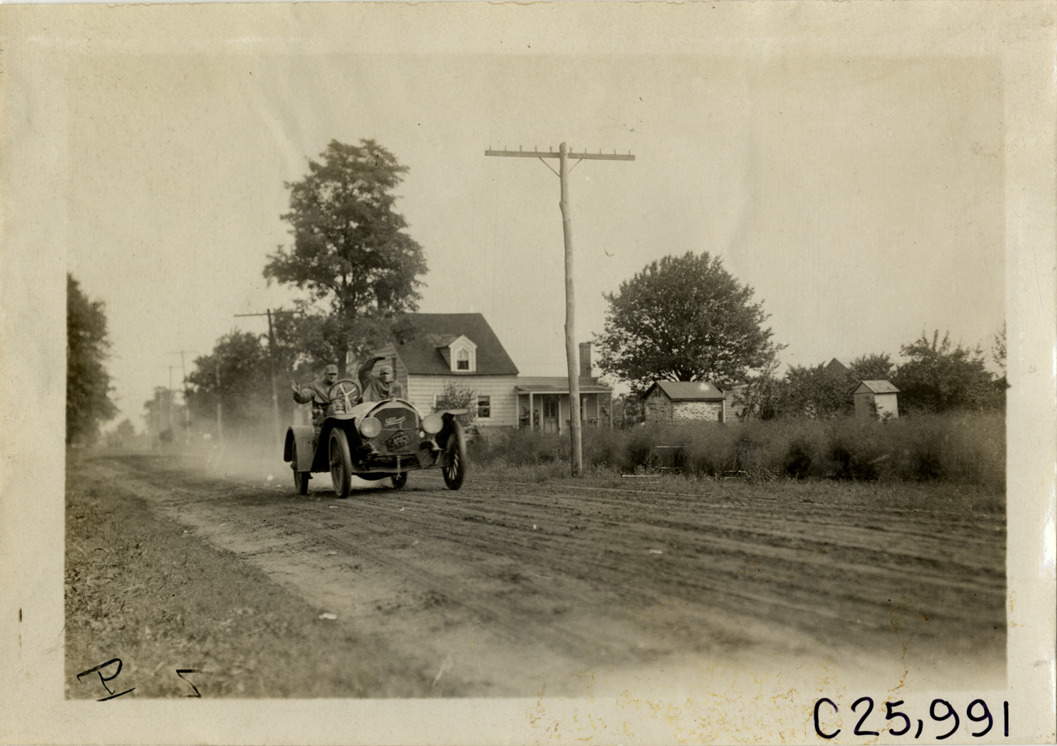 View of motorists in Pullman car traveling on rural dirt road during the 1909 Munsey Reliability Run. Wooden-frame house on roadside. Handwritten on back: "Tours--Munsey Reliability Run, 1909."