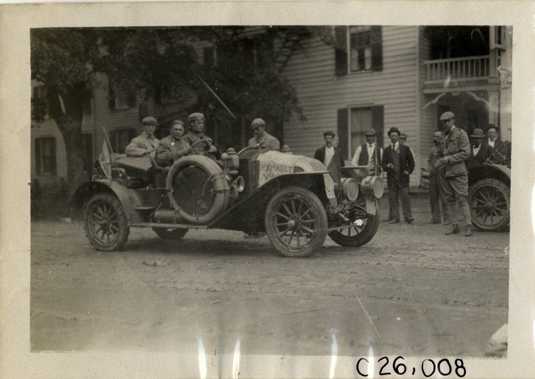View of motorists posing in Renault car during the 1909 Munsey Reliability Run. Spectators and wooden-frame building in background. Handwritten on back: "Tours--Munsey Reliability Run, 1909."