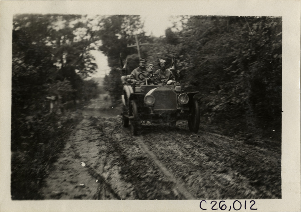 Motorists in automobile traveling on rural road, 1909 Munsey Reliability Run