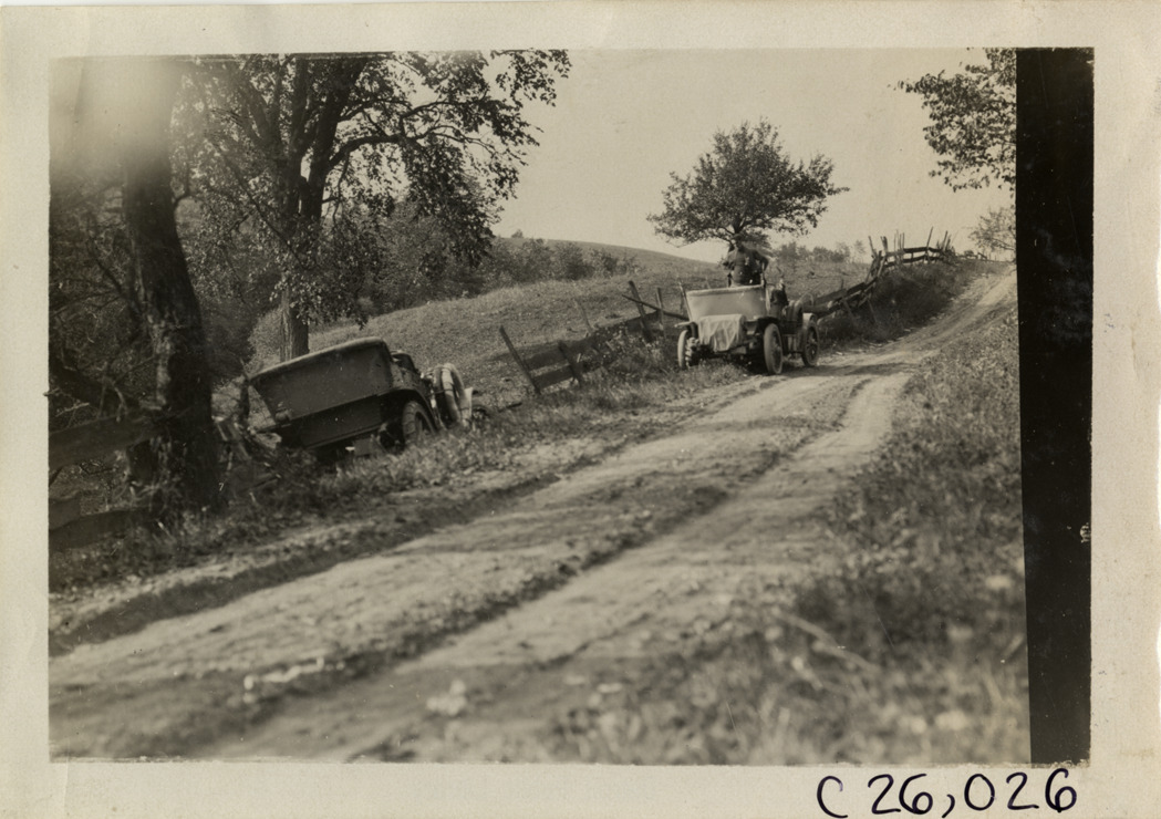 Automobile in ditch on roadside, 1909 Munsey Reliability Run