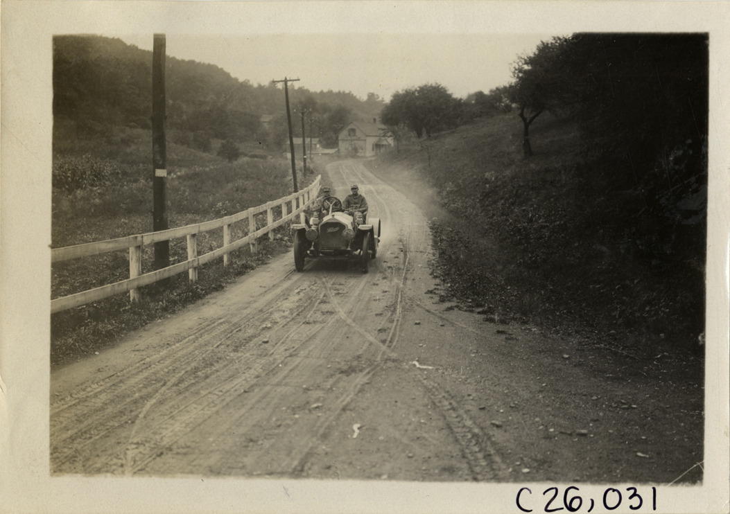 View of motorists in Pullman car traveling on rural dirt road during the 1909 Munsey Reliability Run. Stamped on back: "Photo by Spooner & Wells, Inc. 1931 Broadway, N.Y." Handwritten on back: "Tours--Munsey Reliability Run, 1909."