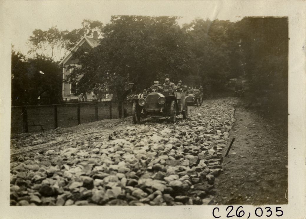Motorists in automobile traveling on stone-covered road, 1909 Munsey Reliability Run