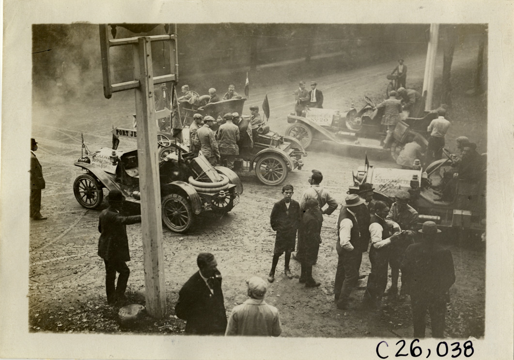 Motorists waiting in road with automobiles, 1909 Munsey Reliability Run