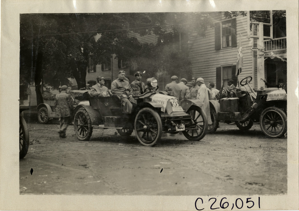 View of motorists in Croxton-Keeton car no. 16 during the 1909 Munsey Reliability Run. Maxwell car and wooden-frame house in background. Handwritten on back: "Tours--Munsey Reliability Run, 1909."