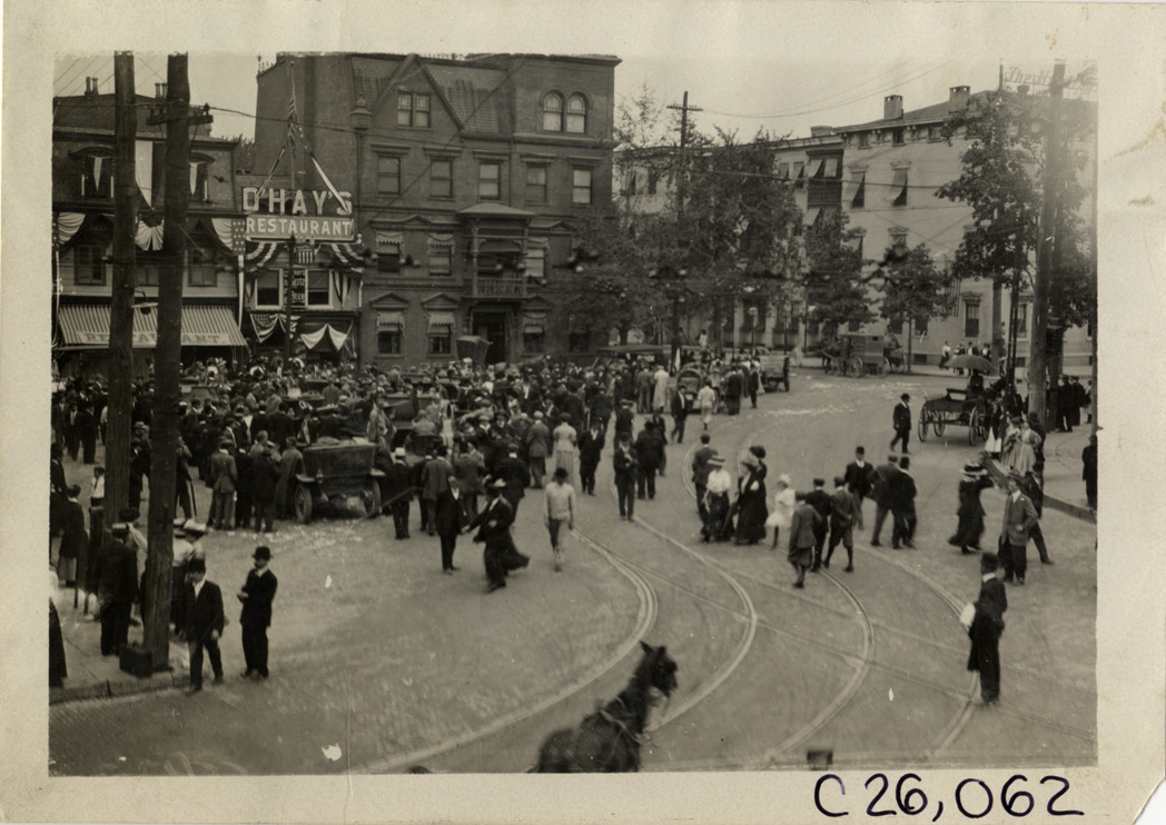 View of crowd surrounding cars at Easton, Pennsylvania during the 1909 Munsey Reliability Run. O'Hay's restaurant and other commercial buildings in background. Handwritten on back: "Tours--Munsey Reliability Run, 1909."