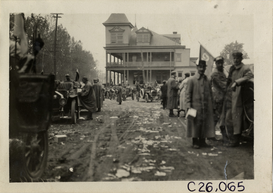 View of motorists with cars in road during the 1909 Munsey Reliability Run. Straw or excelsior is scattered on ground; wooden-frame building with cupola in background. Handwritten on back: "Tours--Munsey Reliability Run, 1909."